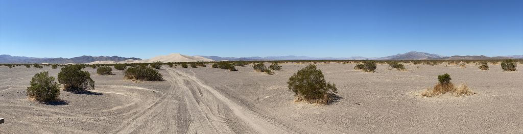 23.09., Dienstag: Auch der Sonnenaufgang war sehr schön, dann ging es los über endlose Highways, vorbei am Death Valley (da schon Nachmittag, wollte ich nicht den Eintritt für 2, 3 Stunden verplempern – außerdem waren es dort 35°C! Die Big Dune weckte mein Interesse. Da ich ja ein 4×4 PKW habe, dachte ich: nichts wie hin! Der Weg war auf den ersten 1,5 km ganz OK, bei den letzten 1,5 km (man kann durch die klare Luft die Entfernungen hier fast nie richtig einschätzen!) traute ich mich dann aber doch nicht weiter. Der Wagen fing an in den Spurrillen nach links und rechts zu rutschen, ich kannte weder den weiteren Weg, noch das Auto und seine Geländegängigkeit und ich war allein auf weiter Flur – und das Telefonnetz war hier nicht vorhanden. Also umgedreht, was noch relativ problemlos ging.
