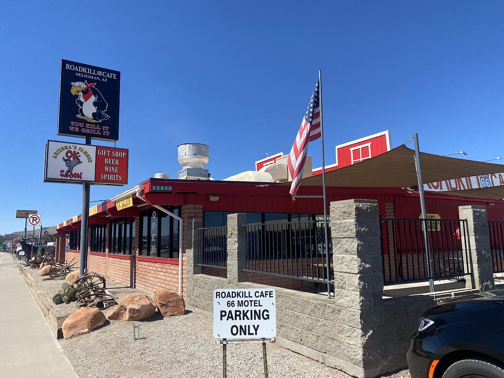 24.09., Mittwoch: Petrified Forest war das Ziel für heute, da es dort wesentlich niedrigere Temperaturen werden sollen. Allerdings sind das 600 km, daher in Seligman auf der Route 66 erst einmal Rast gemacht. Hier habe ich auch in einer urigen Kneipe zu Mittag gegessen, ihr Slogan war: „You kill it – we grill it!“ Daher auch der Geier als Wahrzeichen! 🙂 OK, einen per Auto erlegten Kadaver hatte ich nicht, daher habe ich mich dann für einen Hamburger entschieden.