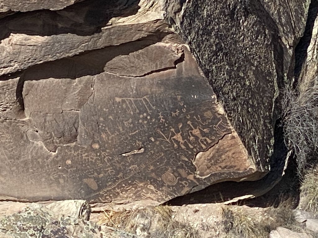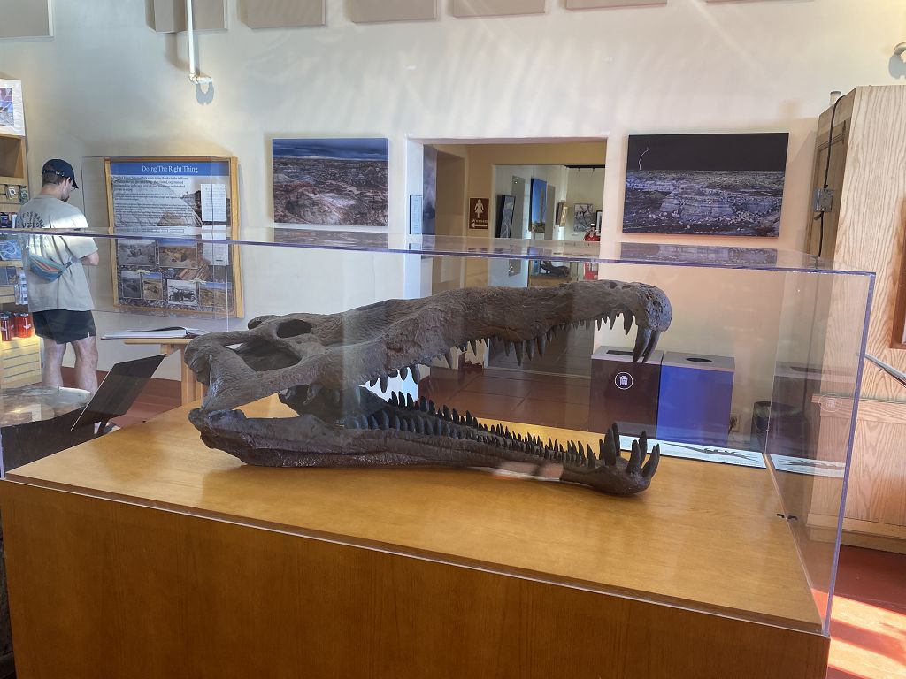 Zunächst das Museum besichtigt, wo auch Krokodilskelette, Dinosaurier und interessante Details – wie z. B. Borkenkäfer – die schon damals den Bäumen das Leben schwer gemacht habe – gezeigt wurden. Dann ab in die Außenanlage, von dort weiter über 26 mls durch den Park mit etlichen Parkplätzen und Wegen zu den interessantesten Punkten, z. B. auch mit Ritzzeichnungen der Ureinwohner. 11 km habe ich abgelatscht, die Sonne brannte erbarmungslos, aber im Hintergrund türmten sich schon fette Wolken.