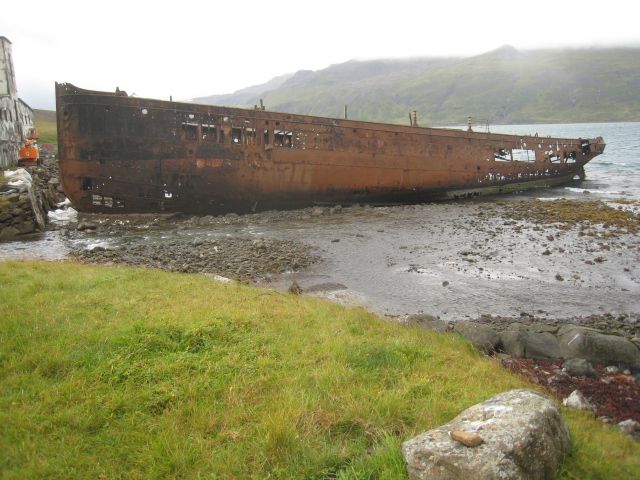 22.08.2010 Anfangs-km: 135.570, End-km 136.755, gefahren 185 km Es stürmt die ganze Nacht, morgens ist es dann auch noch bewölkter als am Vortag. Daher heute weniger Fotos von der Tour. Ich überquere also wieder einen Bergkamm, um dann auf der anderen Seite quasi den letzten Westfjord abzufahren. Bei Dynjandi komme biege ich auf die Straße ab, die mich nach Látrabjarg bringt. Kurz nach dem Abzweig findet man dieses erste Schiff aus Eisen Islands, welches hier 1981 auf Grund lief.